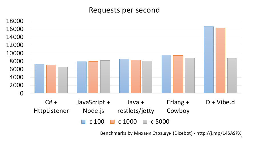 Vibe.d is web framework that take advantage of the native speed, the easy-to-understand syntax and high-level features of D like fibers. Vibe.d is to D what Node JS is to JavaScript (EcmaScript). Vibe.d is very fast.